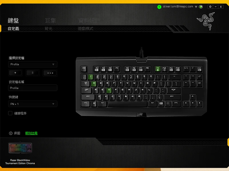 Game Mode 顧名思義就是遊戲的模式,按下 Fn + F10 就能夠啟動,在 Game Mode 開啟後 BLACKWIDOW TOURNAMENT EDITION CHROMA 會鎖上 Win 鍵,防止用家誤按彈出遊戲,另外在 Synapse 設定頁面內亦可以加入鎖上 Alt Tab 及 Alt F4 等快捷鍵。