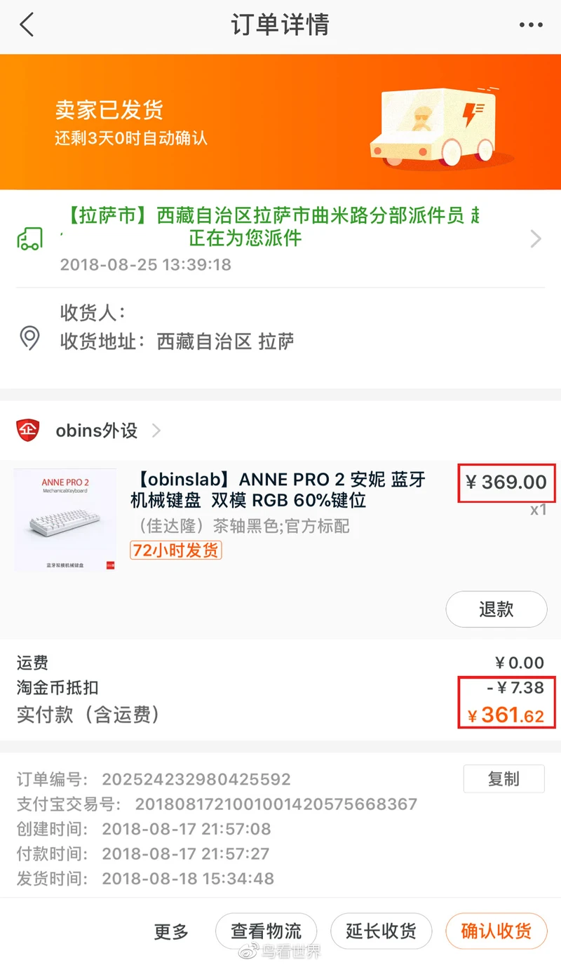 第一次是购买是2018年8月17日,在这之前有咨询过客服,但是没有买。在8月17日购买,原价369到手价361.62。因为淘金币抵消了部分钱。