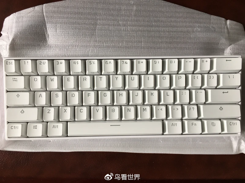 从袋子里面拿出键盘,感觉白色是米白色,下面的照片因为当时房间的灯光是有点暖黄色,所有点偏色,不是键盘应有的颜色。