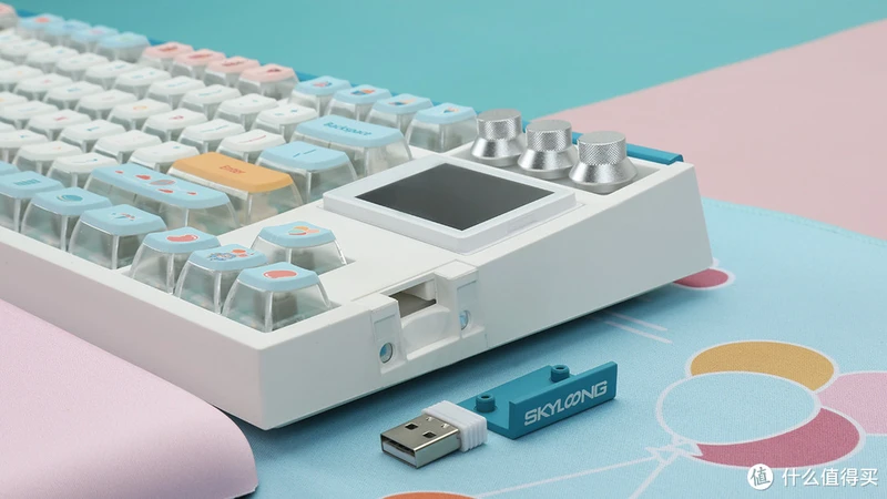 键盘顶部与右下方的“Skyloog”的金属铭牌均采用磁吸固定方式,不仅可以收纳无线适配器,更可进行多配色的更换。它们有着湖蓝色、红色、白色、黑色、深蓝色与浅绿色,能够满足大部分用户追求个性化配色的选择,并且磁吸力度适中,拆卸安装都很方便,细节处理相当到位。