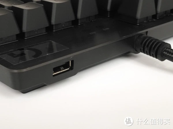 ▲USB端口处采用了防拉扯设计。上面都带有图案,一面为罗技G的标识,另一面为接口的识别图标,一个供键盘的数据传输,另一个作为键盘USB拓展口的数据以及充电之用。USB金属端口并没有过采用镀金涂层。比较可惜的是USB拓展端口可以连接 USB 3.0 设备,但只能提供 USB 2.0 端口的传输与充电速率